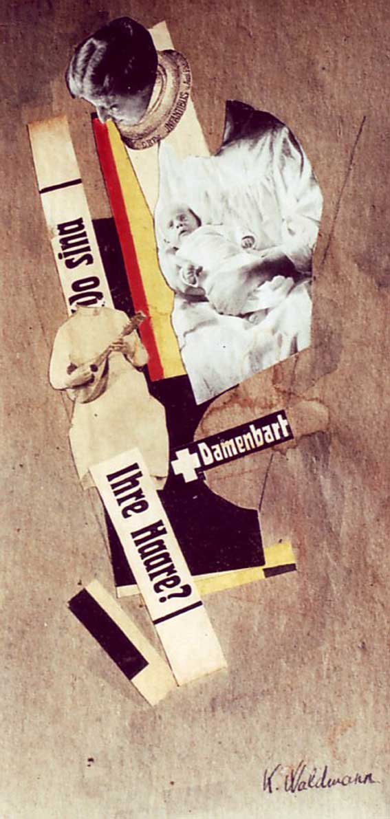 Where Is Your Hair?| collage of: a head of a woman who has a metalic thing around her throat, a woman without head who is holding a baby in her arms, body of a woman without head who is playing the guitarre, black, red and yellow stripes (colors of the flag of germany) and the five words "wo sind ihre haare" ("where is your hair?") "damenbart" (facial hair of a woman) which were cut off from a newspaper. beside the word "damenbart" is a cross which was used as a symbole for hygiene. |