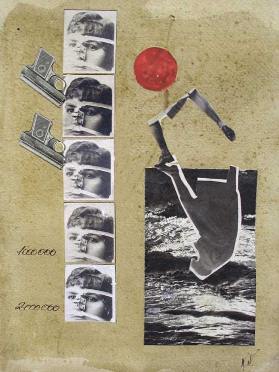 | cinq photos identiques du visage d'un jeune garçon recouvert par une sorte d'instrument médical. un revolver est collé à côté de deux des photos et les chiffres 1000000 et 200000 sont écrits manuellement à côté des deux photos du bas. a droite, on voit un cercle peint en rouge, la silhouette d'une femme, des jambes de femme et une image d'eau en noir et blanc. |
