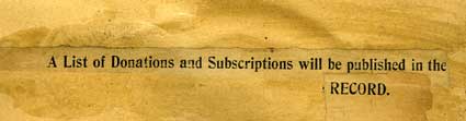 Au verso de l’oeuvre Inscription "A List of Donations and Subscriptions will be published in the Record" Une liste de dons et de cotisations sera publiée dans le dossier