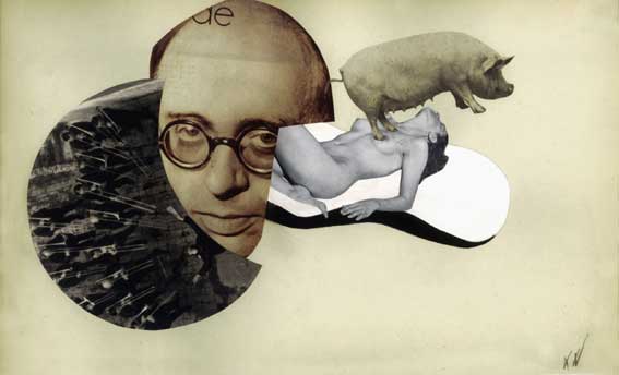 a group of trombone players with a conductor. a naked woman is under a pig. in the middle, there is a picture of osip brik, who was born on the 16th january 1888 and died on the 22nd of february 1945. he published several russian literary newspapers. in 1912, he married lilya yurevna. she fell in love with poet mayakovski and their affair lasted until his suicide in 1930.