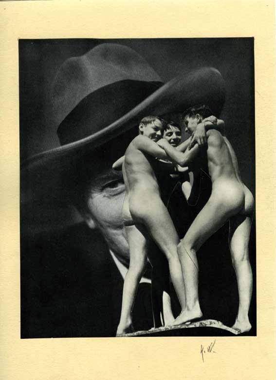 Description | trois jeunes hommes nus sont collés sur la photo d'un homme portant un chapeau. |