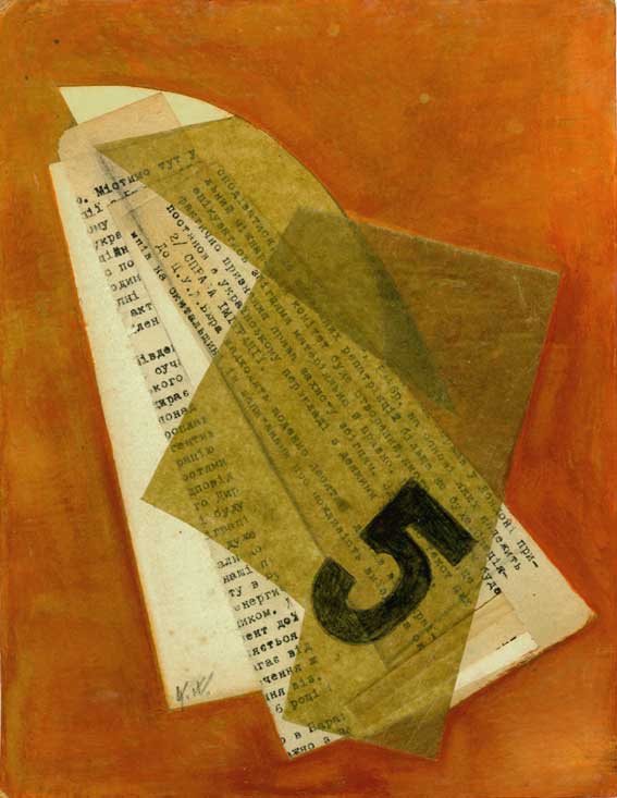 | collage abstrait effectué sur un fond orange. assemblage de morceaux de textes russes, de papiers transparents et du chiffre 5. |