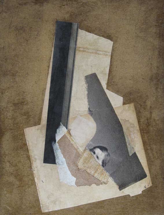 collage de différentes formes de papier et tissu noires, beiges et blanches et d'un morceau de photographie où on voit une tête de femme.