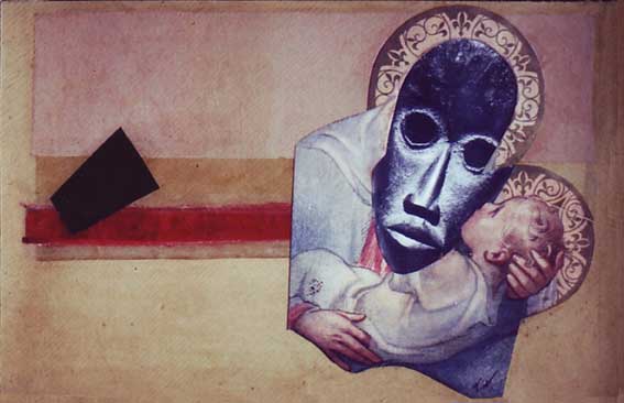 | image de marie tenant jésus dans ses bras. sa tête est remplacée par un masque africain. ils ont tout deux une auréole autour de la tête. en fond, collage de papiers beiges, roses, rouges et noirs. |