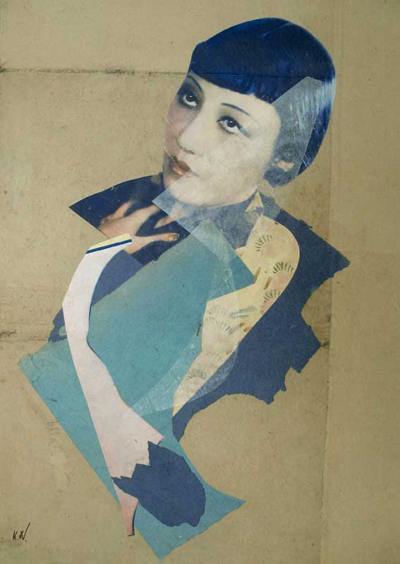 Ulla| head of a asiatic woman, very rouged, with an eton crop which was the famous haircut in the twenties. her hand lays on her throat. instead of the upper part of the body there are stick down different pieces of paper (white, blue, rose). one seems to be the right arm and the other patterned piece seems to be her right shoulder. the left part of her face is covered by a transparent piece of paper. |