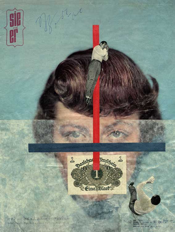 il s'agit d'une couverture du magazine "sie und er" (elle et lui) datant du 10/11/1950. elle montre une femme dont le visage est flou, l'artiste ayant collé un papier transparent dessus. sa bouche est cachée par un billet d'1 dm. deux hommes ont été collés sur la couverture. au verso: un publicité pour une crème fabriquée à paris et new york. texte: surrealistische spielerei eines farbphotographen = jeu surréaliste d'un photographe couleur. l'oeuvre n'est pas signée.