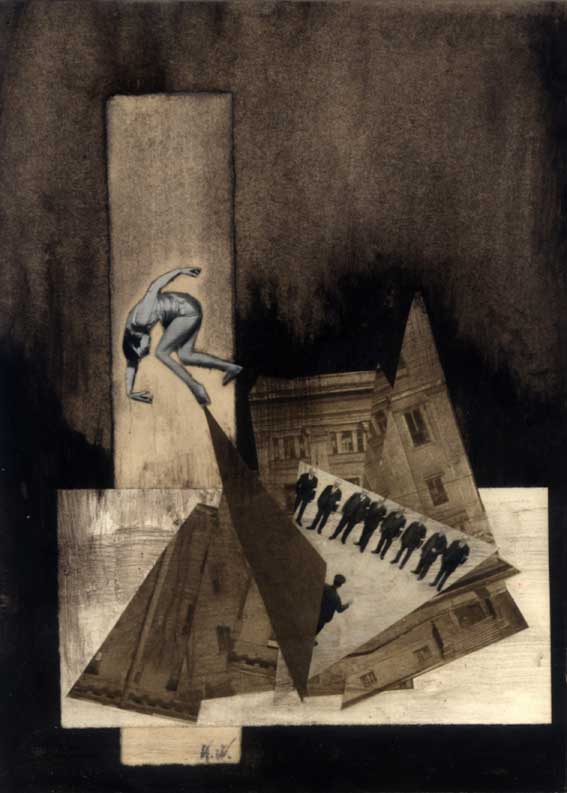 a three-dimensional picture of a dancer. in the background, there is a building and the picture of a man in front of eight other men wearing a white armband around their left arm.
